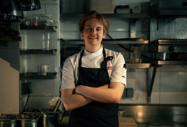 – Jeg er ganske rastløs, så det å stå på kjøkkenet, jobbe med råvarer, lære teknikker og holde tempo, passet meg bra, forteller Mathias. I dag er han sisteårslærling som kokk ved Fyr og Stallen. Foto: Smak deg frem
